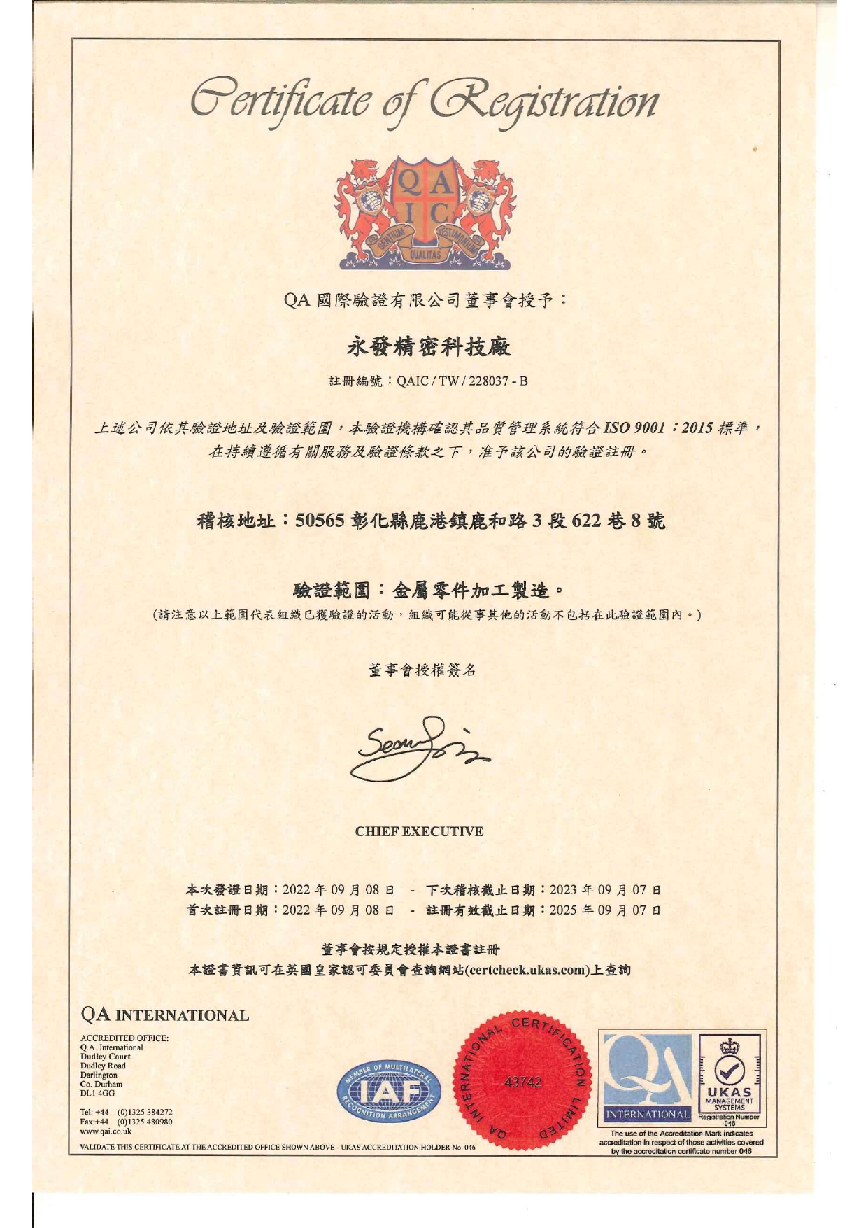 品質檢測 品質檢測 我們重視測量方法的重要性,使用最新的檢測技術和精密測量儀器,對每批產品進行全方面的管控,提升品質的穩定性,並且通過 ISO 9001:2015。 品檢設備 2.5D投影機 表面粗糙機 高度規 電子卡尺 內徑分釐卡 外徑分釐卡 塞規 外牙環規 內牙栓規